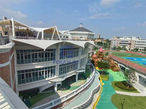 佛兰空间设计和项目施工人员,经过结构优化设计、变形分析、安装措施及高精度测量控制,最大限度消除了安装过程中可能带来的结构的变形,保证了该幼儿园中庭膜结构的美观性,同时还为小朋友玩耍提供了一个能遮阳挡雨的温馨空间。