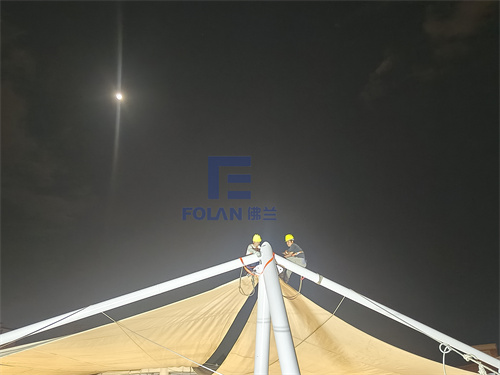 因幼儿园白天上课,所以项目只能周末和晚上施工,佛兰空间项目施工人员赶工夜战,历时20天完成了该扇形中庭膜结构的安装。
