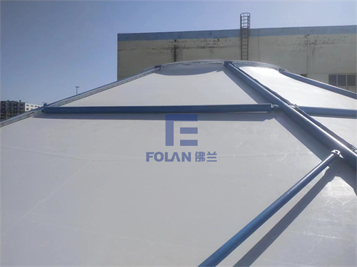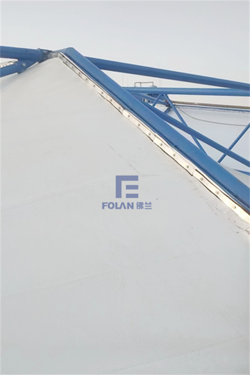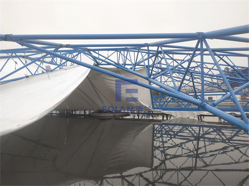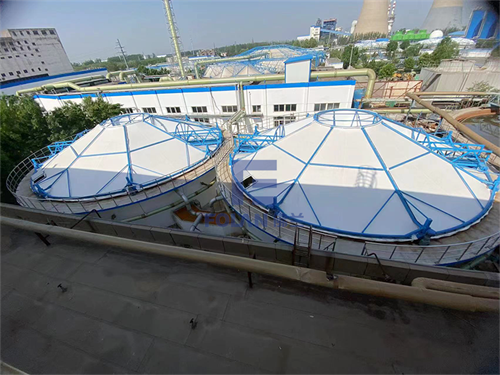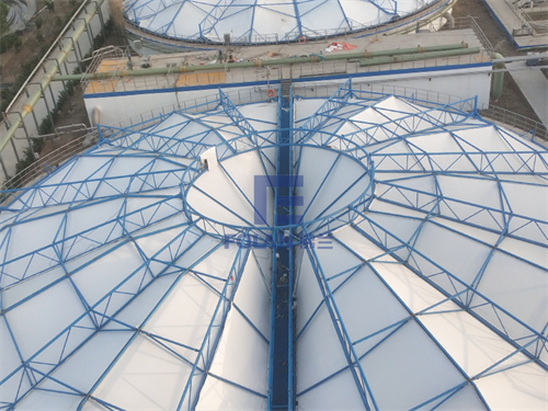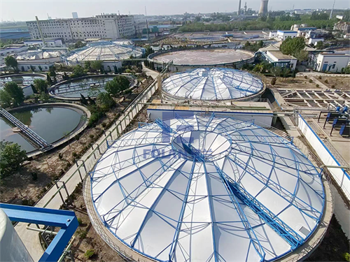 山东的4个污水池,采用钢架式反吊膜加盖方式,选用进口双面PVDF抗酸碱、抗腐蚀膜材,以全新的技术实现钢构反吊安装。