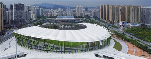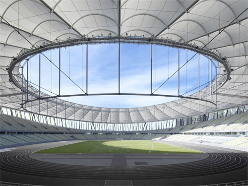 体育场馆一般都是大跨度空间,风吹、雨水都能让建筑大规模受力,这就要求膜材的强度够高,抗撕裂性能好,要不然建成的膜结构建筑很容易在外力作用下变形甚至是撕裂。而PTFE膜材,最大的特点就是强度高,能满足大跨度空间的受力要求,此外它还防水阻燃,是所有建筑膜材中安全性能最高的膜材。