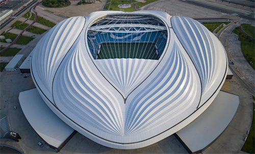 卡塔尔AlJanoubStadium体育场是座可容纳4万人的足球场,体育场的可伸缩式屋顶采用了PTFE膜材,展开时屋顶就像一个船帆,覆盖在球场的上方,为夏天足球比赛创造了一个遮蔽的环境。