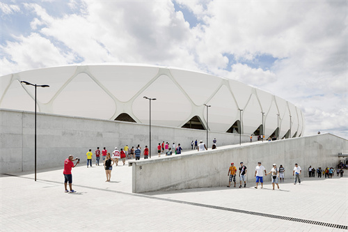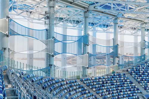 体育场顶棚是半开放式的PTFE膜结构,纯白的颜色和独特的造型引人注目,顶棚可遮盖所有的席位,使游客坐在席位上观看比赛免受日晒雨淋。