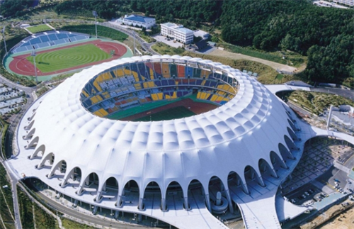 釜山亚运会主竞技场是一个标准的圆顶建筑,直径约为228米,由48根人形斜柱和垂直混凝土柱组成,屋顶钢索与其他下部支撑的钢筋混泥土柱相对应,分成48个部分,索桁架由环顶索、径向索、垂直索和立柱组成。