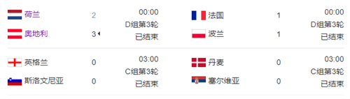 D组中,法国队1-1与波兰队战平,荷兰队2-3爆冷负于奥地利队,奥地利队力压法荷二强获得小组头名,法国、荷兰分列二三位出线。