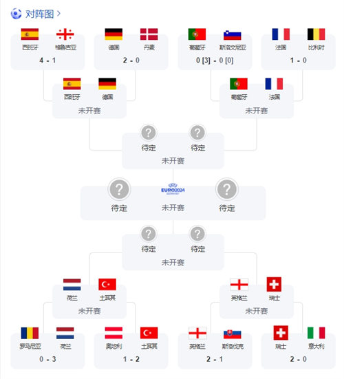 至此,本届欧洲杯八强全部产生,1/4决赛对阵也已出炉,具体赛程如下(北京时间):